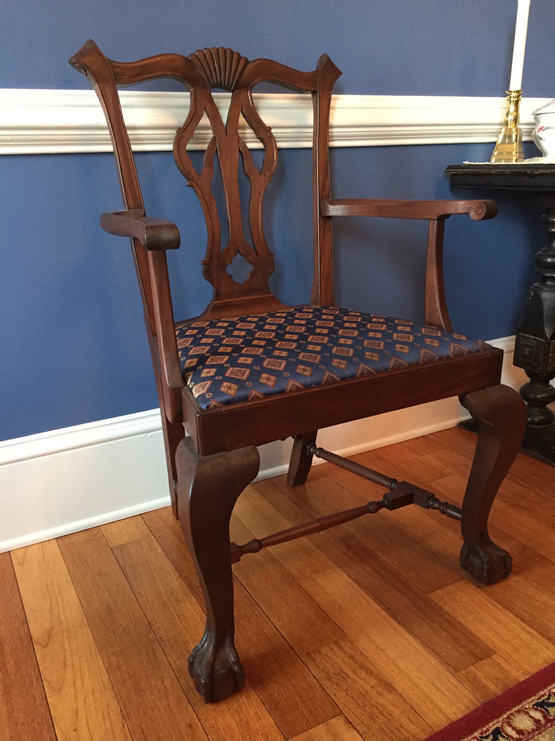 After a 1-month course in chair making at the North Bennet Street School, I made a set of 8 Chippendale chairs for my dining room. In addition to the complex joinery involved in attaching the side rails and arm rests to the posts, these required extensive carving for the top rails, back splats, cabriole legs and arm rests. The wood is mahogany, stained dark to match the table.