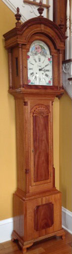The clock above is a copy of a Newport tall case clock attributed to John Townsend. The primary wood is African mahogany. The door blocking and lower panel are of crotch mahogany. The flaming finials are turned and then carved. The shell on the door is applied. The face was painted by Theresa Gritti, my wife's sister. Pine was used as the secondary wood. The finish is tung oil and shellac.