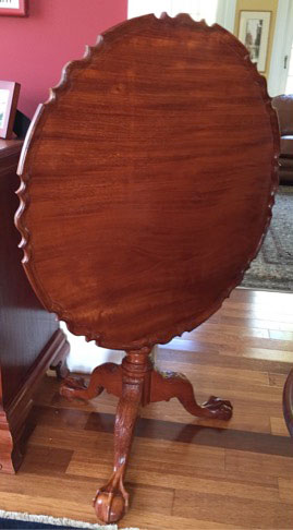 This Philadelphia tilt-top tea table above has a 32-inch diameter top made from a single board of Brazilian mahogany. This top came from wood left over from my block front bureau table. The legs and post are hand carved. The finish is tung oil and shellac.