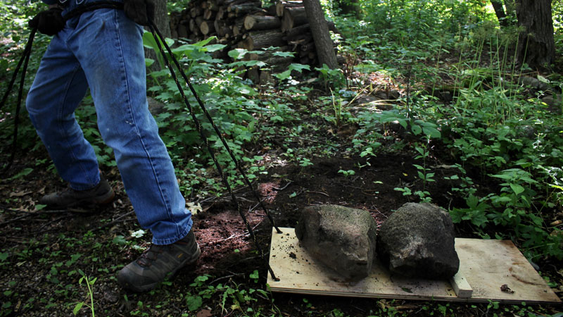 I was (barely) able to roll the stones onto the improvised sled, but with the ropes in hand I could slide the stones relatively easily. Pulling the rope tilted the front of the plywood up a bit, and that kept the wood from digging into the ground. This was a five-minute "putz" with wood that solved a real problem.