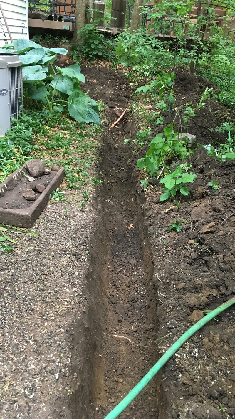 The most critical project this summer was to finally correct some semi-serious drainage issues around the house. This involved digging some 205 feet of ditches and burying six-inch diameter drain pipe. And this is when a simple project began to morph into something entirely different… and the saga started.