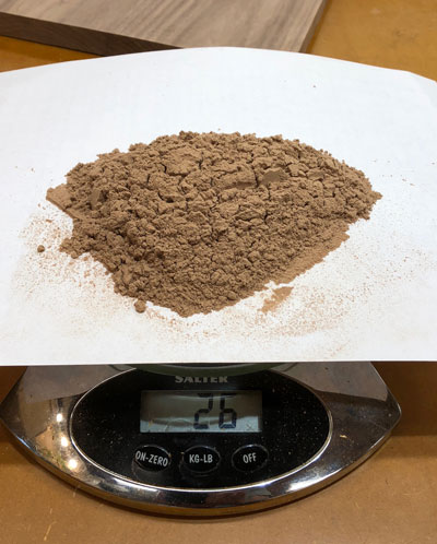 The sander I tested was brand new, as was the dust collection bag, so there was no residual dust in the bag prior to sanding. After the test I dumped out the collected dust… I really worked hard to get it all out, but of course some was left in the pores and nooks and crannies of the bag. The collected dust weighed 26 grams. A little math indicates that the effectiveness of the dust collection bag was 81.25%. I should have weighed the new dust collection bag prior to use and weighed it after cleaning it out to see how much dust was still adhered to the bag, but I suspect the amount was negligible, so I stand by the efficacy of the test.