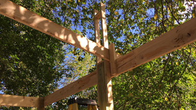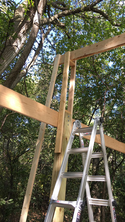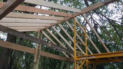 After all this work, I was feeling pretty good about things, so I positioned my ladder at the south end of the ridge board and climbed up to attach my first rafter. Wrestling with the two-by-six rafter while swaying about 14-feet up in the air on a ladder resting partly on concrete and partly on muddy uneven ground made me more than just a bit shaky. Falling off a ladder is not part of my barn-building plan, so the next day I put up a baker-style scaffold and got back to work.