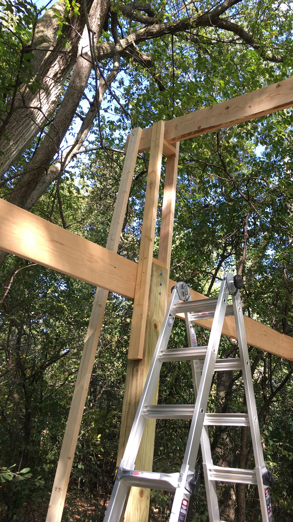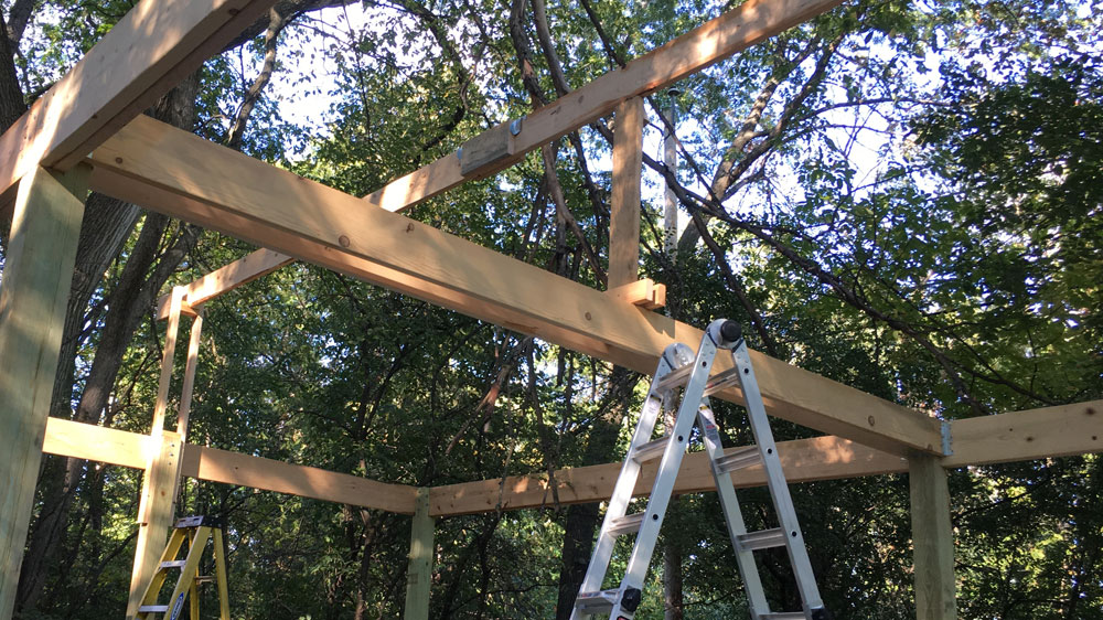 The assembled ladders were quite heavy. I spent a solid two hours getting the first one in place and attached. The next day a buddy came to help and we got the other three installed in less than an hour. It helps to have help! In fact, it was only with my friend's help that I was able to get the OSB sheathing installed. The first row at the low end of each side of the roof was the toughest. Getting the pieces lined up and nailed in is definitely a two-person job. The second row is a little easier because once the sheet is on the roof and above the first row, it will slide back and stop against the first row. Also, once the first row is installed, the roof feels way less "wobbly" and you can work from the roof instead of a ladder or a scaffold.