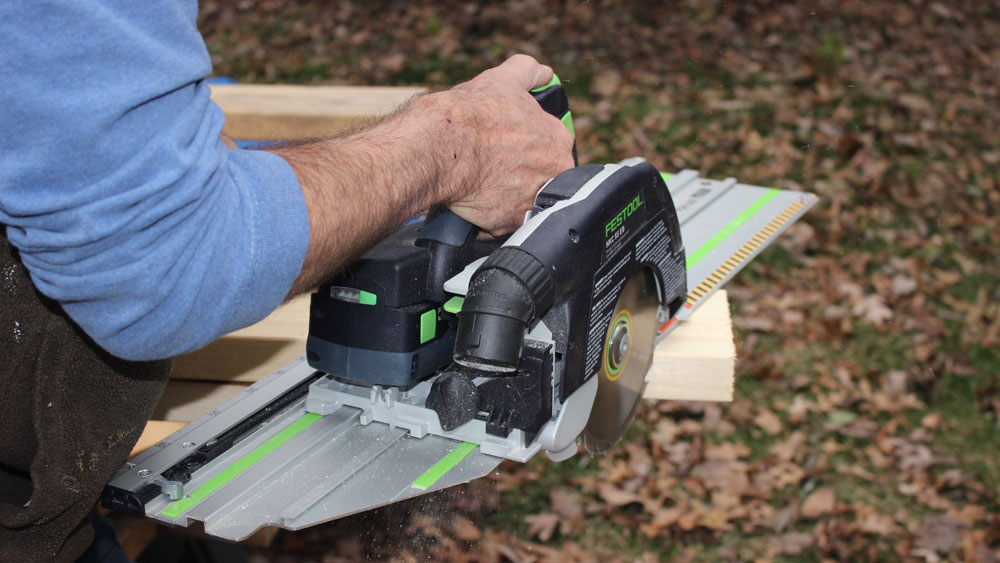 The FSK 420 Guide Rail allows you to set angles and then do repeated cuts that are as precise as any miter saw can produce. The angles for my rafter ends were to be 22.62º and while 22.5º is clearly marked on the Guide Rail, 22.62º might seem like it would take a little trial and error. But not so… I simply positioned the saw and guide rail on one of my template boards, adjusted the angle perfectly and tightened down the locking knob. Every cut thereafter was perfect.