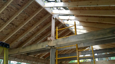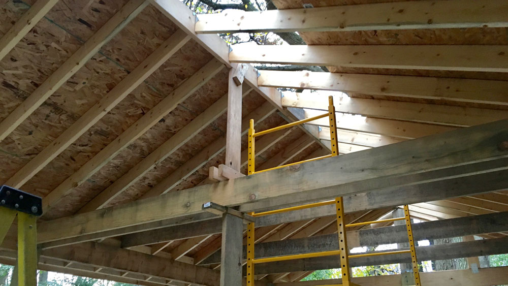 temporary brace in the middle of the ridge board. In this image you can also see the splice