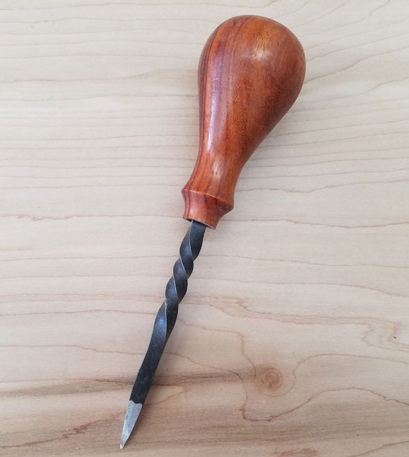 was designed for both beauty and functionality. Ideal for starting and drilling holes, the awl's shaft is hand forged and twisted from O1 steel. The tip is sharpened for starting and boring holes which the square shank then widens through repeated twisting. The shape of the handle fits nicely into the palm of your hand to provide a firm grip. Each awl handle is hand turned from a solid block of Padauk, a wood valued for its toughness and stability, as well as its rich color.
