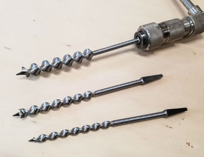 The auger bit, used with a hand brace, was the primary means to drill a hole prior to the