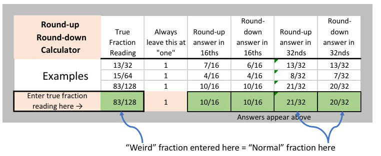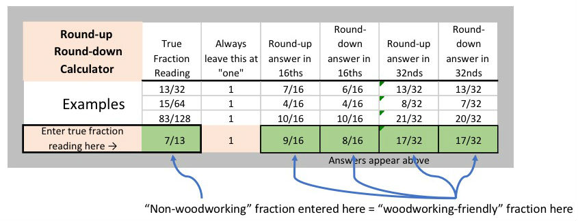 The "Round-up Round-down Calculator" can also be used to convert fractions that are not common to woodworking tapes and rules. For example, if you stumble on a measurement like 7/13" (and I have), simply enter that exact fraction where indicated, and the answer will appear in both 16ths and 32nds.