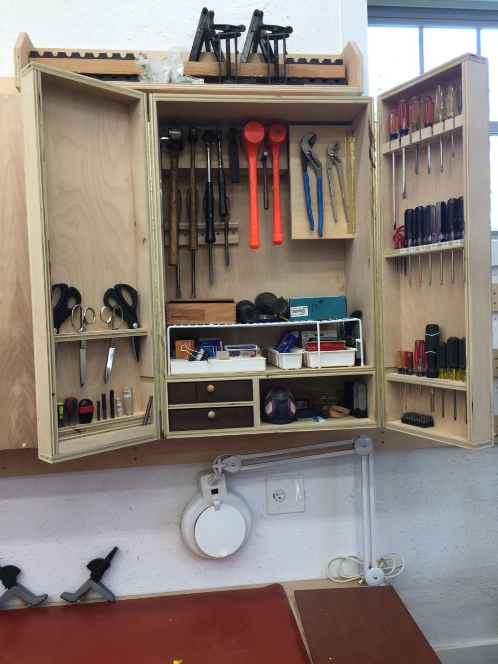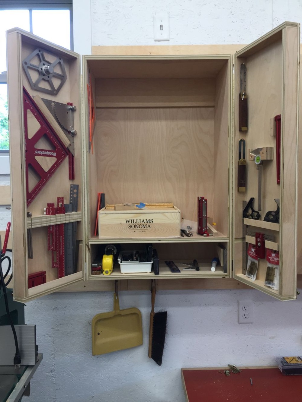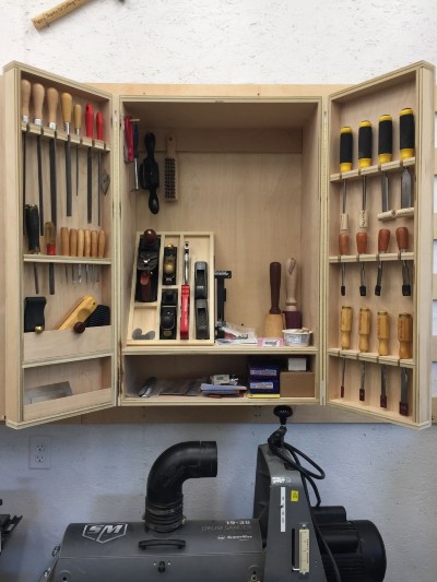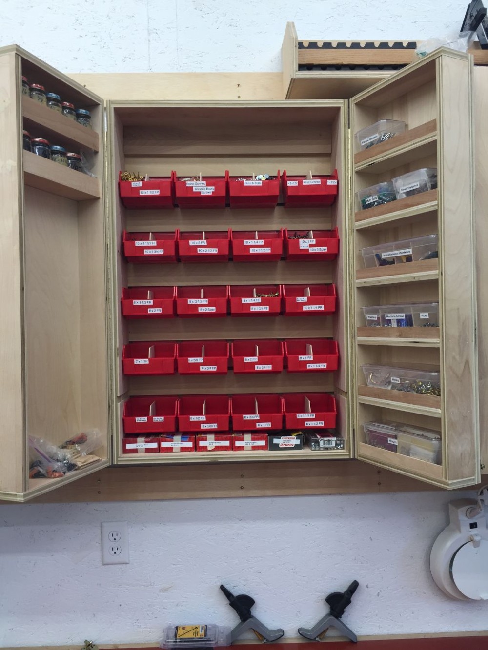 bandsaw, and two more cabinets: one for marking and measuring, and one for fasteners. Once I