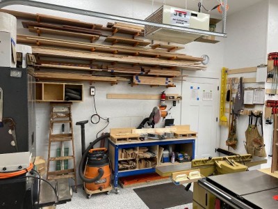 The north wall of the shop has lumber storage and my miter saw station. I