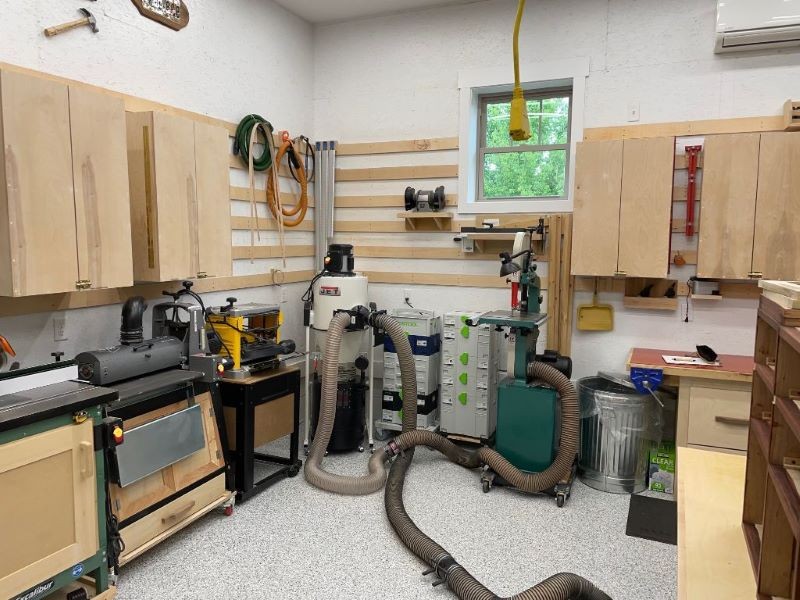 The southeast shop corner shows the dust collector, Festool stack, the