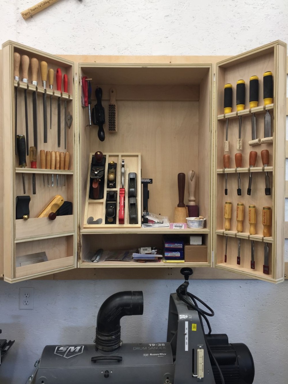 and accessories), drum sander, and planer. The second cabinet on this wall has planes, scrapers,