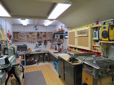 My shop measures 18 x 10 feet. I had a two car garage that I took half of to build my shop. I built the shop myself, doing the framing and insulation of the walls and ceiling. I framed out the door, which was my first attempt at installing a door and it ended up not being as hard as I had thought it would be. I installed laminate for the workshop floor.