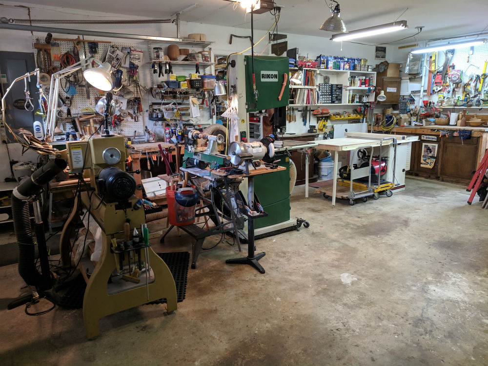 noisy tools, like the planer, are stowed on roller skids for moving (to outside patio if