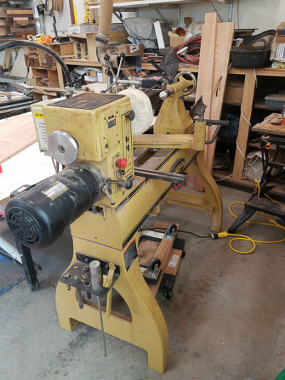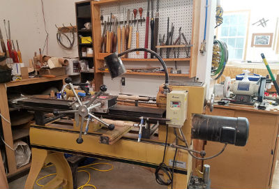 Along the opposite side of the shop is a Powermatic lathe. It takes up the corner with various gouges and tools hanging on the wall.