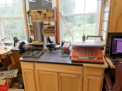 You can also see the beginning of my sanding area. I have a variety of small sanders...oscillating spindle sander, small belt/disk sanders and a 1' belt sander. It's handy to have them all together and again, I use a shop vac here and move the hose between sanders as needed.
