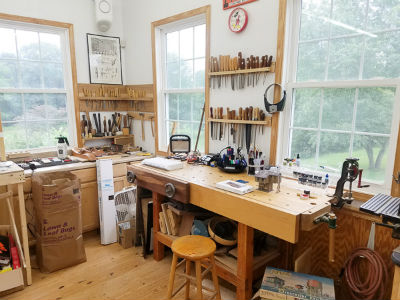 The heart of the handwork area contains my workbench, hand tools and sharpening station. I have various sets of Ashley Iles carving gouges and bench chisels hanging on racks on the walls. They are easy to get to, especially since I'm 6'4"! I like using a Moxon vise on the front of my bench because I can place a board into the center of the vise as I create hand cut dovetails. It holds the boards firmly and there is about a 24" space between the two handles. When I built the addition I made sure that I had plenty of windows for daylight in this part of the shop.