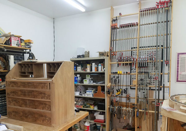 The opposite corner has my clamp rack. As they say, "You can't have too many clamps!" I have a variety of clamps from small c-clamps up to 8 foot long pipe clamps. In the foreground is a project I've been working on 'for awhile'. It is a slant front desk based upon a style from the early cabinetmakers in the Shenandoah Valley.
