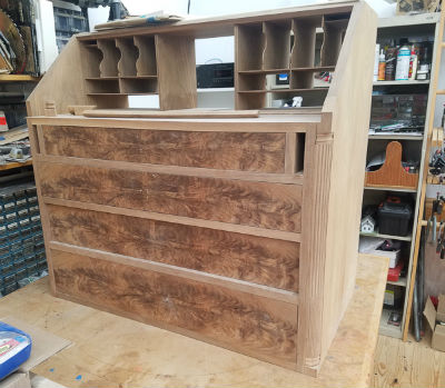 The desk is made of walnut with veneered, book matched, drawer fronts. This desk has been in the shop for a couple of years now. Unfortunately, I only work on it in between other commissions, and you can see that the walnut on the case sides has lightened appreciably. The one downside of all the windows in the shop is that there can be too much light and can lighten and/or darken woods like walnut and cherry.