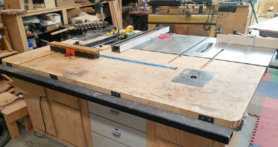 and two routers mounted in the outfeed table behind the tablesaw.