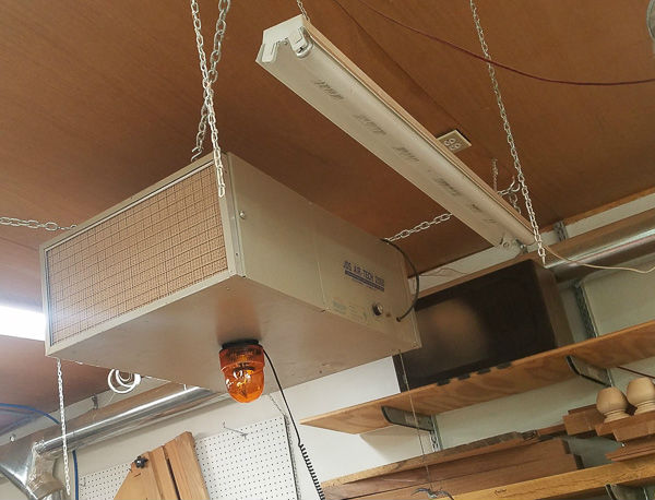 I mentioned my Oneida dust collector and I also have an air filtration system hanging from the ceiling. One funny aspect of the air filter is the strobe light hanging off the bottom. We have an Amazon Alexa voice activation system in the house and in the shop so now when my wife sends me a text message on my cell phone and I don't answer she can tell Alexa to turn on the strobe light to get my attention!