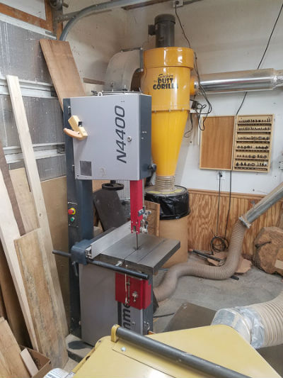 Located behind the planer and sander is a Hammer 16' bandsaw and my Oneida 5hp cyclone dust collector. It's pretty amazing how quickly the 55 gallon drum fills up with chips! My neighbor loves the chips for his chicken coop!