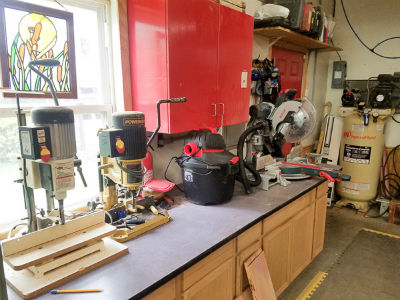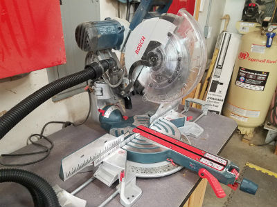 To the right of the entrance door is where I breakdown wood using my miter saw. I just recently purchased a Bosch 12' sliding miter saw. I really like the design of the Bosch miter saw because it can be placed up against the wall and the articulating arm allows the head to move forward without requiring extra space behind the saw. Right now the small shop vac on the bench is used with the saw but that will eventually be placed inside the cabinet with the hose coming up through the bench top.