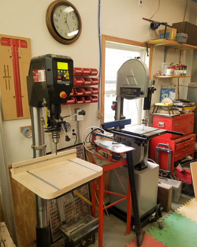 Further along the same wall is a Delta 14' bandsaw and my new Nova drill press. The Nova drill press is a pretty incredible tool with a built-in computer to facilitate setup and operation. It's pretty funny to read in the instruction manual to hook your computer's USB cable to the drill press to upgrade its internal software!