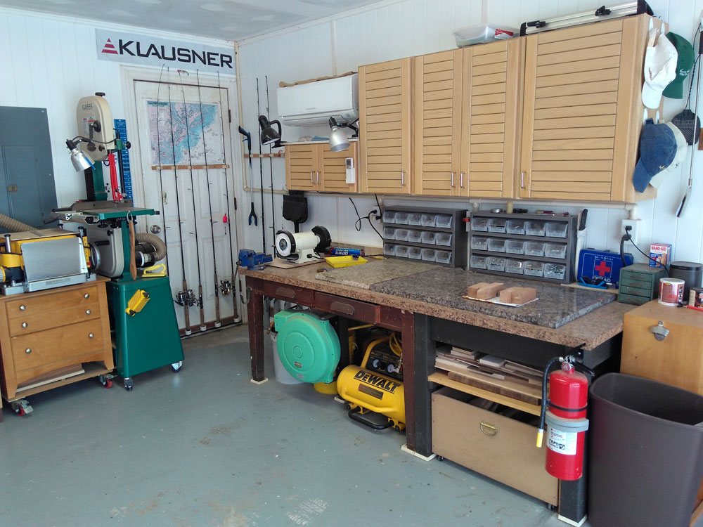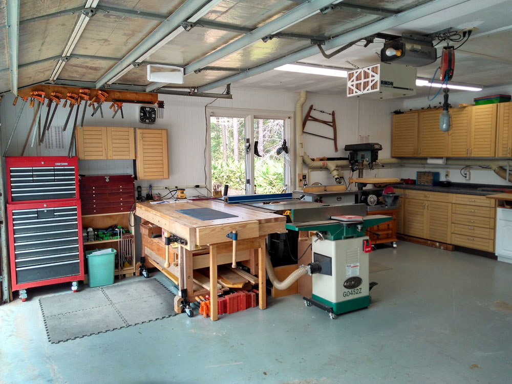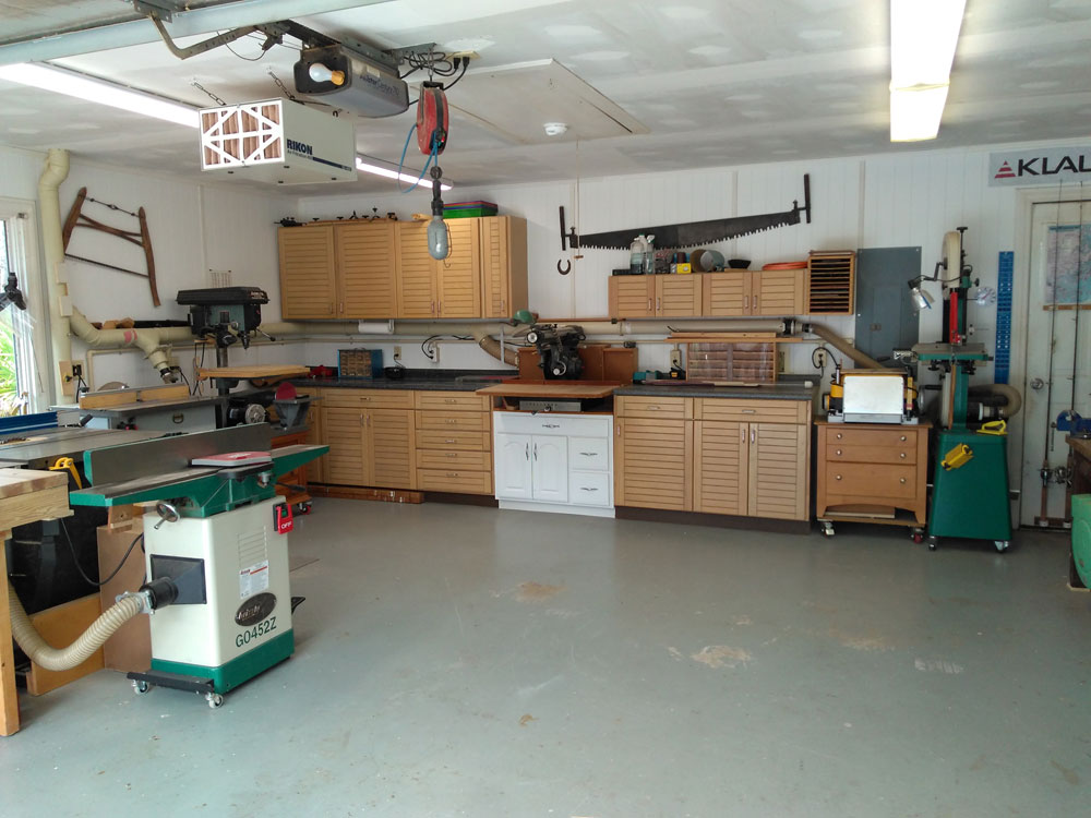 I took over our garage (22' x 22') using half of the width, the back wall, and a narrow portion on the opposite side, being careful to leave enough room for my wife's car when I'm not making a mess. Wood storage is in the attic above the shop along with a dust collector connected to 4” piping around the shop. A mini-split air conditioner/heater makes for a year-round shop and also serves as a dehumidifier. An air filtration system hangs from the ceiling.