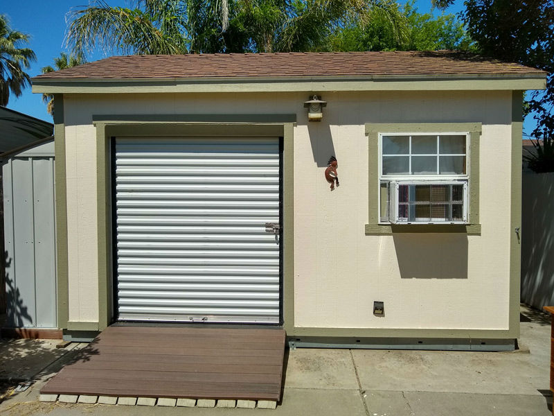 Street view of the shop. Note roll-up door and and