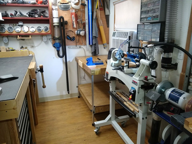 The lathe has lockable casters and can be rolled out of the way if working with sheet goods or larger