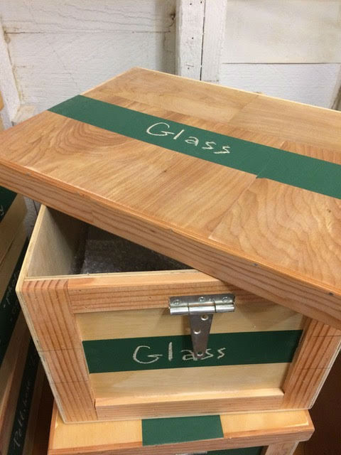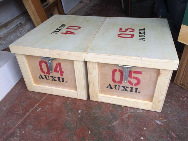 Before adding stencils or chalk board paint, exteriors all received one heavy coat of semi-gloss polyurethane; crates can then withstand a little rain, transport in bad weather, or worst of all, a slightly leaky workshop roof! To save time and effort I leave all interiors sanded but unfinished.