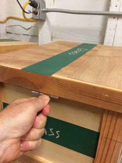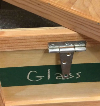 A nice detail: felt squares added to the bottom protect chalked notations on top of other crates. Especially important as you drag one crate off another. Squares are placed flanking the top strips — so they never erase your written label. Four pieces of 1" x 2" works well.